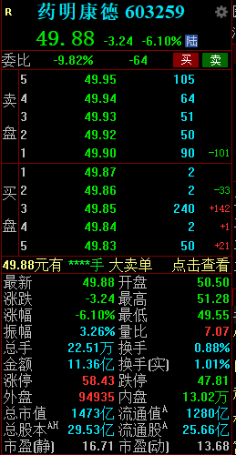 2月19日消息,药明康德再澄清不构成国家安全风险,药明康德A股开盘大跌,截至发稿跌逾6%,股价报49.88元;药明康德港股涨超4%。