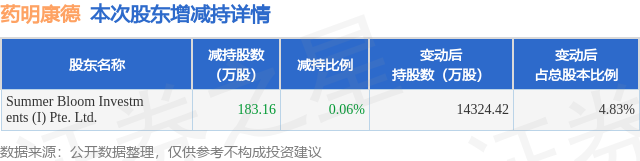 证券之星消息,2月23日药明康德发布公告《药明康德:股东减持股份结果公告》,其股东Summer Bloom Investments (I) Pte. Ltd.于2023年11月28日合计减持183.16万股,占公司目前总股本的0.0617%,变动期间该股股价上涨1.34%,截止11月28日收盘报84.24元。