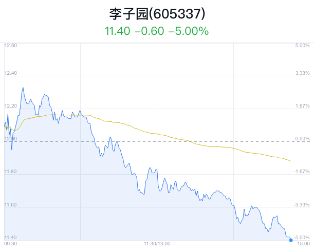 02月28日,李子园(605337)股价大幅下跌,截至14点45分,李子园下跌5.00%,报11.40元/股,成交5948万元,换手率1.27%。