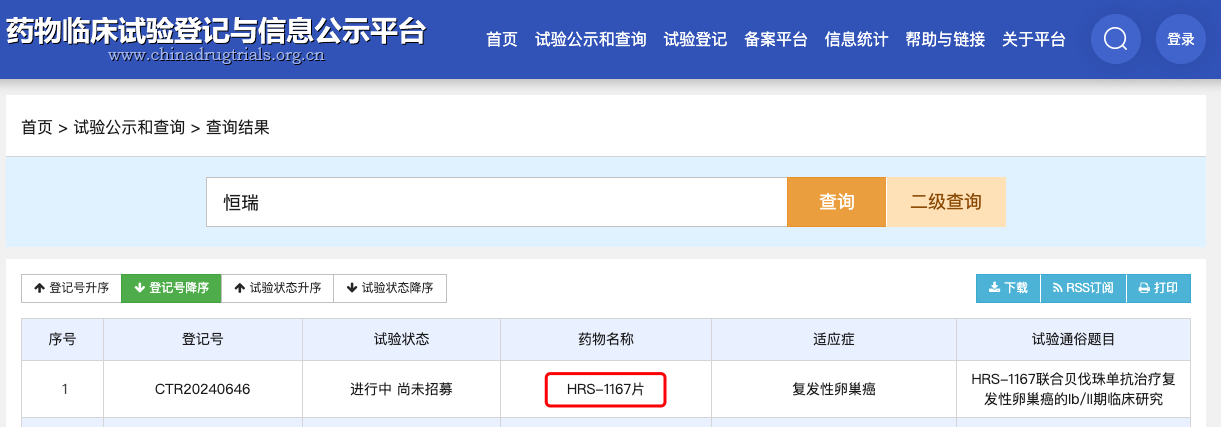 2月26日,据中国药物临床试验登记与信息公示平台官网公示信息,恒瑞医药登记了一项HRS-1167联合贝伐珠单抗治疗复发性卵巢癌的1b/2期临床研究,HRS-1167是恒瑞医药自主研发的PARP1抑制剂。