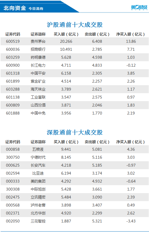 前十大成交股中,净买入额居前三的是贵州茅台、招商银行、五粮液,分别获净买入13.86亿元、7.71亿元、4.36亿元。