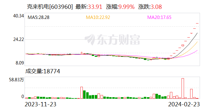 2月23日,克来机电开盘一字涨停,录得11个涨停板,截至发稿,该股报33.91元,换手率0.54%,成交金额4823万元,涨停板封单超15万手。