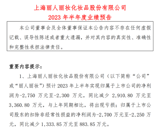 当晚丽人丽妆同时披露的2023年半年度业绩预告显示,在2022年报出亏损后,今年上半年该公司延续了业绩颓势,净利润同比转亏。