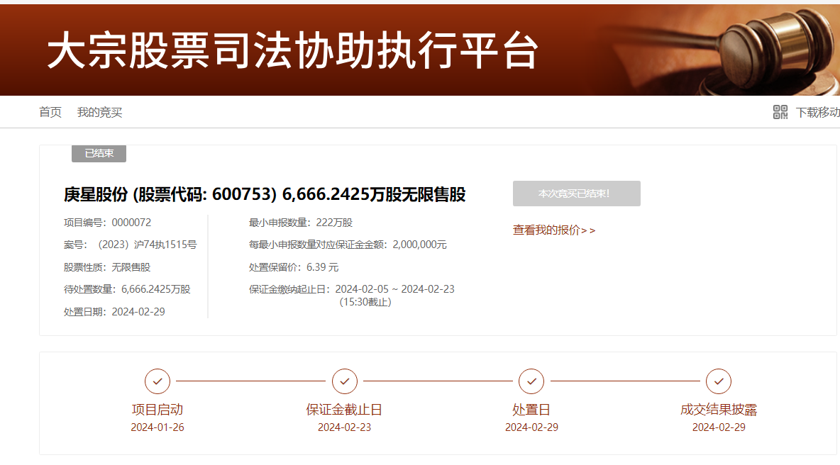乐居财经 王敏 2月29日,上海证券交易所大宗股票司法协助执行平台信息显示,庚星股份(股票代码:600753)6666.2425万股无限售股被拍卖,竞买人最小申报数量为222万股。拍卖结果显示:股票已悉数成功出让。