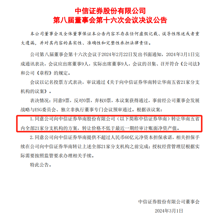 中信证券大动作!全部转让华南五省21家分支,对华南公司整合加速,承诺事项完成中