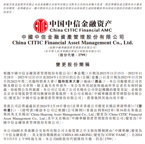 2月29日,中国华融发布公告称,自2024年3月5日上午9时起,股份简称变更为“中信金融资产”,英文简称变更为“CITIC FAMC”。届时,中国华融的名号,将彻底消失。