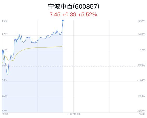 02月26日,宁波中百(600857)股价大幅上涨,截至11点12分,宁波中百上涨5.52%,报7.45元/股,成交1736万元,换手率1.07%,振幅6.94%。