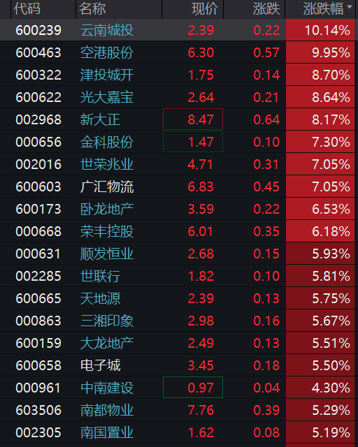 2月19日,房地产板块午后异动拉升,云南城投直线涨停,津投城开、光大嘉宝、新正大张超8%,金科股份、世荣兆业涨超7%,卧龙地产、世联行、大龙地产、中南建设等跟涨。