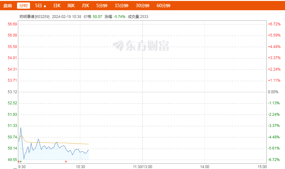 红星资本局2月19日消息,药明康德(603259.SH)今日开盘受挫,盘中一度大跌6.72%。截至发稿,跌幅有所收窄,跌5.74%,报50.07元/股,总市值1479亿元。