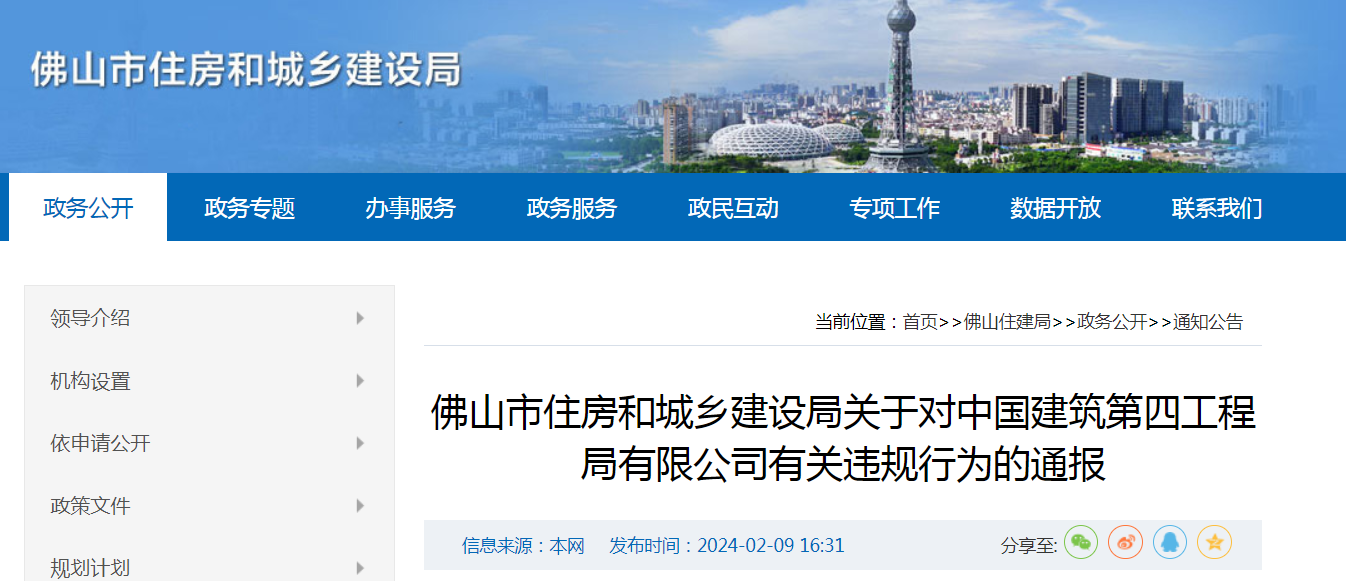 佛山市住房和城乡建设局关于对中国建筑第四工程局有限公司有关违规行为的通报