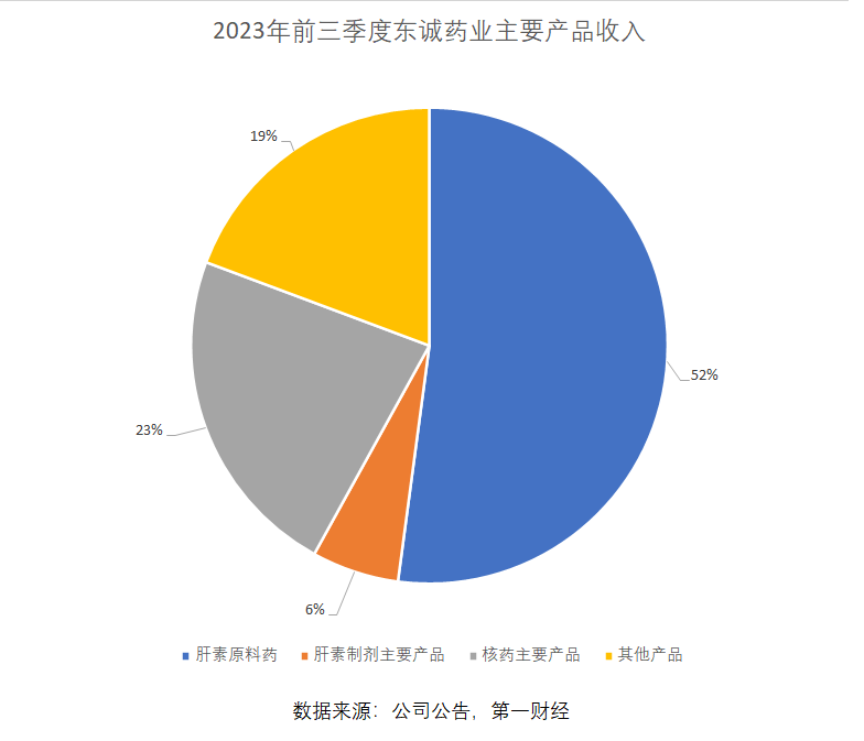 尽管东诚药业在核素药领域持续发力,但肝素钠原料药及相关制剂依然是其主要业务。截至2023年前三季度,该公司肝素钠原料药实现收入13.47亿元,制剂业务实现收入1.53亿元,合计占该公司营收的58%。