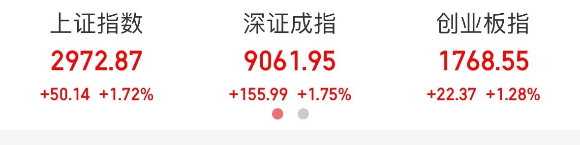 2月21日,A股早盘低开高走,三大指数均涨超1%。截至收盘,沪指涨1.72%,报2972.87点。深成指涨1.75%,报9061.95点。创业板指涨1.28%,报1768.55点。