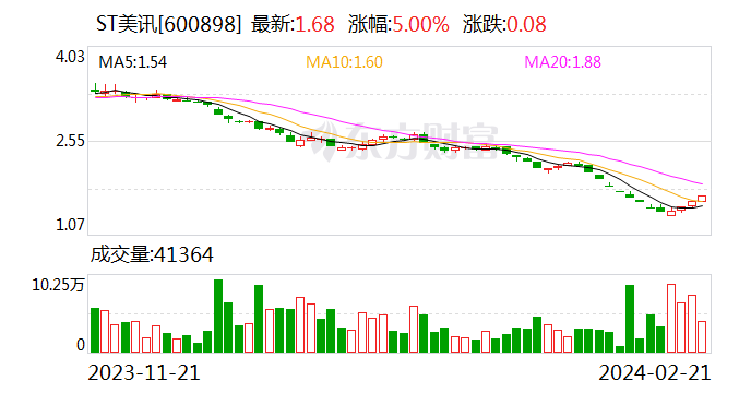 ST美讯盘中涨停,已连收3个涨停板,截至9:50,该股报1.68元,换手率1.44%,成交量362.50万股,成交金额593.70万元,涨停板封单金额为117.18万元。连续涨停期间,该股累计上涨15.86%,累计换手率为6.96%。最新A股总市值达4.79亿元,A股流通市值4.24亿元。