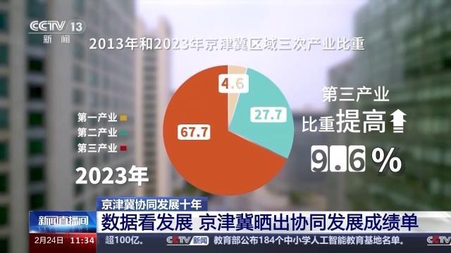 总量提升的同时,三地产业结构也在持续升级。京津冀三次产业构成由2013年的6.2:35.7:58.1变化为2023年的4.6:27.7:67.7,第三产业比重提高9.6个百分点。其中,北京三产占比保持在八成以上,天津占比超六成,河北突破五成且提升最快,三地三产比重较2013年分别提高5.3个、8.6个和11.4个百分点。