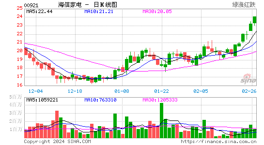 【港股通】海信家电(00921)续涨逾3% 公司管理层预计2024Q1利润同比增长15%左右