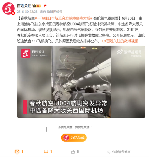另有媒体报道称,现场视频显示,机舱内氧气罩脱落,乘务员在安抚旅客。21时许,春秋航空客服人员证实,该航班运行时飞机突发故障已备降。公开信息显示,该航班由波音737飞机执飞,具体原因及后续安排待公布。