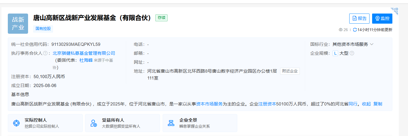 投资界(ID:pedaily2012)8月8日消息,近日,唐山高新区战新产业发展基金(有限合伙)成立,执行事务合伙人为北京骐健私募基金管理有限公司,出资额5.01亿人民币,经营范围为以私募基金从事股权投资、投资管理、资产管理等活动。合伙人信息显示,该基金由唐山高新区国有控股集团有限责任公司、北京骐健私募基金管理有限公司、河北省机器人产业基金(有限合伙)共同出资。