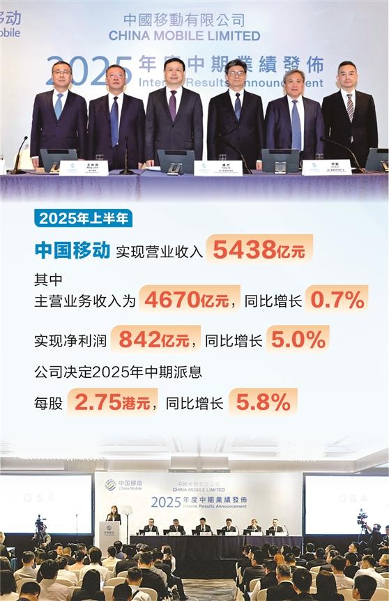 8月7日晚间,“万亿央企”中国移动(600941)披露了2025年半年度报告。数据显示,2025年上半年,公司实现营业收入5438亿元,其中主营业务收入为4670亿元,同比增长0.7%;净利润为842亿元,同比增长5.0%,相当于日赚4.65亿元。公司决定2025年中期派息每股2.75港元,同比增长5.8%。