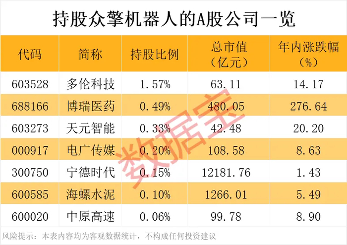从新增股东名单看,不但有京东,还有一众A股公司。证券时报·数据宝通过企查查不完全梳理发现,包括宁德时代、多伦科技、天元智能、电广传媒、海螺水泥、中原高速等上市公司,都新增成为众擎机器人间接股东。