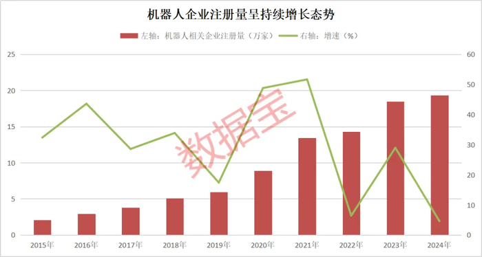 截至目前,今年前7月已注册机器人相关企业15.28万家,较去年同期相比,增长43.81%,增速远超去年全年注册水平。