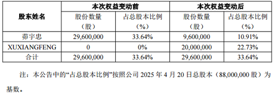 公告称,本次权益变动前,茆宇忠直接持有公司29,600,000股股份,占公司总股本的33.64%;同时持有威士顿(上海)资产管理有限公司98.67%的股权,威士顿(上海)资产管理有限公司持有公司21,000,000股,占公司总股本的23.86%,XUXIANGFENG未持有公司股份。上述股份皆为有限售条件的锁定股份。