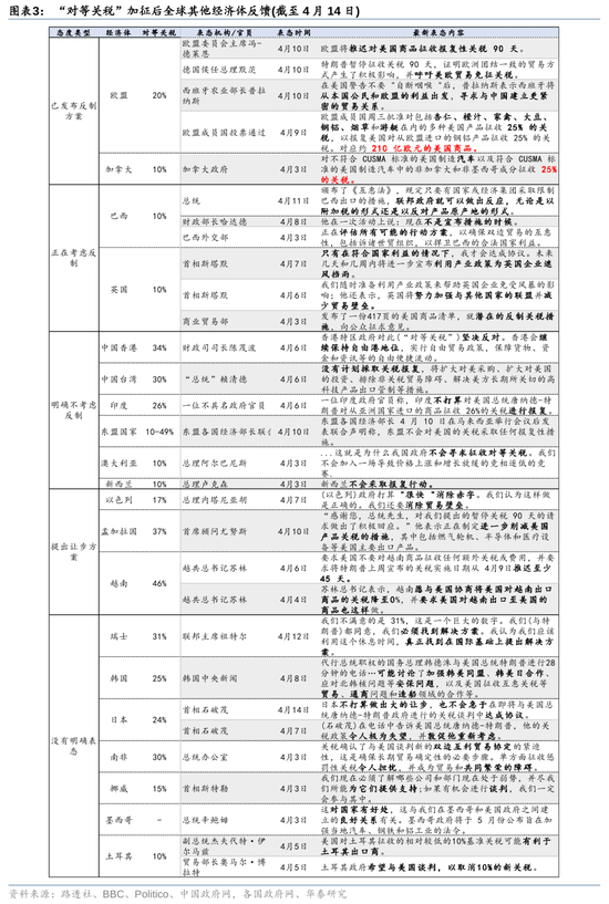 总体看,我们认为政策大框架已清晰,后续重在政策落地的时机和力度。当然,在中国坚决反制美国单边税收政策调整之时,也强调“谈,大门敞开”(商务部)。尽管截至4月14日,对美表态更为积极的国家并未在“对等关税”上获得差异化对待,但较早启动与美国进行关税谈判的日本、韩国和越南等国的进展,或将提供更多线索。