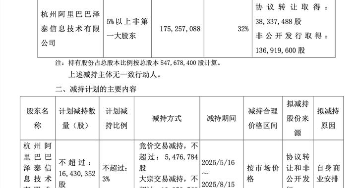 根据公告,阿里泽泰持有三江购物32%股份,共计约1.75亿股,是三江购物第二大股东。其中,拟通过集中竞价交易方式减持不超过547.68万股(即不超过公司总股本的1%),大宗交易方式减持不超过约1095.36万股(即不超过公司总股本的2%)。