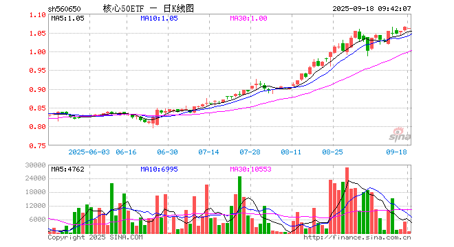9月18日,核心50ETF(560650)开盘跌0.38%,报1.060元。核心50ETF(560650)重仓股方面,东方财富开盘跌1.10%,恒瑞医药涨0.61%,迈瑞医疗涨0.25%,豪威集团涨0.03%,万华化学涨0.01%,阳光电源跌0.70%,福耀玻璃涨0.49%,金山办公涨0.56%,长安汽车跌0.08%,同花顺跌1.90%。
