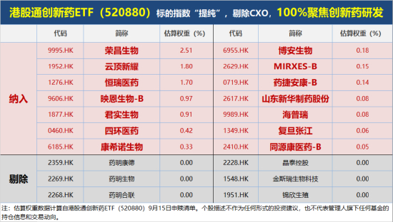 日前,港股通创新药ETF(520880)跟踪的恒生港股通创新药精选指数“提纯”修订生效,完全剔除CXO,并精选纳入14家创新药研发类公司,晋级成为“不含CXO、100%聚焦创新药研发”的纯正创新药指数,精准表征国产创新药硬核力量。
