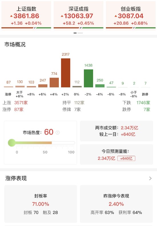 财联社9月16日电,今日市场震荡走高,创业板指一度跌幅超过1%,午后回升翻红,指数黄白线分化,中小盘股表现较强。沪深两市成交额2.34万亿,较上一个交易日放量640亿。盘面上,市场情绪明显回暖,个股涨多跌少,全市场超3500只个股上涨。从板块来看,机器人板块强势领涨,板块内超20只个股涨停,首开股份10天9板。低价股延续昨日活跃走势,掀起涨停潮,报喜鸟、皓宸医疗、山子高科等股涨停。下跌方面,猪肉概念股集体下跌,天域生物跌停。板块方面,机器人、互联网电商、物流等板块涨幅居前,猪肉、有色金属、影视院线等板块跌幅居前。截至收盘,沪指跌0.04%,深成指涨0.45%,创业板指涨0.68%。