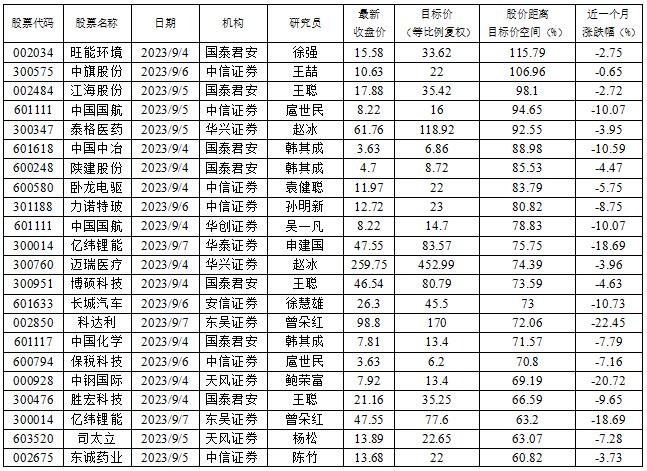 距收盘价向上空间最大的是旺能环境(002034)。国泰君安研究员徐强在9月4日发表题为《旺能环境:垃圾焚烧稳健运营,餐厨项目积极拓展》的中报点评指出,公司固废业务经营稳健,精细化管理水平高;固废业务充沛、现金流及产业资源强大的大股东将有力支撑公司打造第二成长曲线,静待公司再生资源业务发力,维持目标价33.62元。按公司周五收盘价15.58元计算,股价还有115.79的向上空间%。