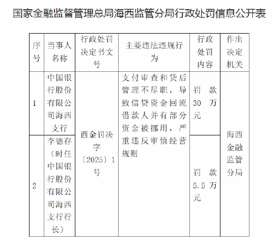 中国银行海西支行被罚30万元:因支付审查和贷后管理不尽职