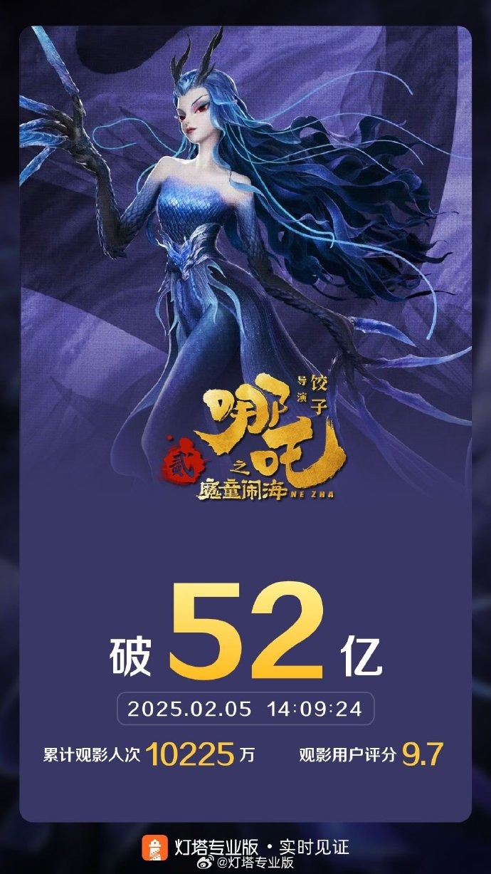 据灯塔专业版实时数据,截至2月5日14时9分,影片《哪吒之魔童闹海》(以下简称“《哪吒2》”)票房突破52亿。 目前与影史票房第一的《长津湖》仅有5亿多的差距。5日稍早,《哪吒2》票房突破50.36亿,已超过《哪吒之魔童降世》进入中国影史票房榜前四。