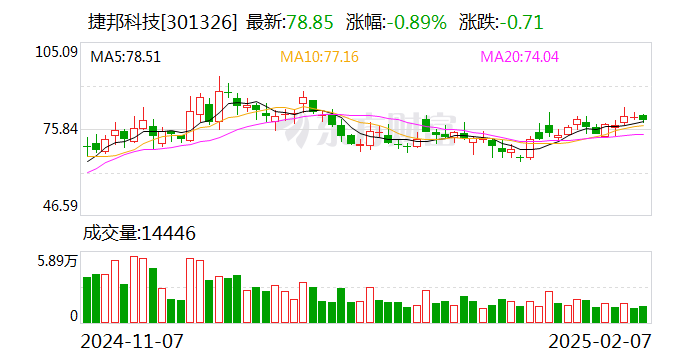 数据显示,截至2月7日收盘,捷邦科技股价为78.85元/股。公司此前已经通过股票回购专用账户以集中竞价交易方式累计回购股份46.57万股,占公司当前总股本的0.65%,回购股份成交的最高价格为37.50元/股,成交的最低价格为23.41元/股。