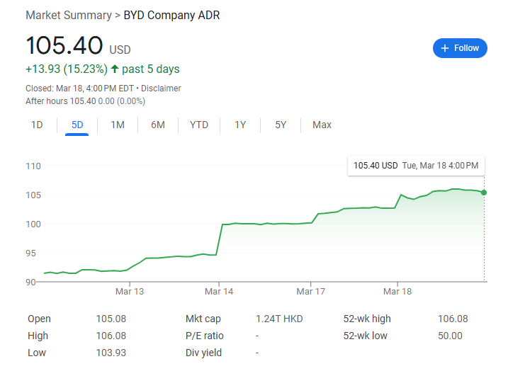 截至昨日收盘,比亚迪ADR在过去5个交易日上涨了超15%,至105.4美元。