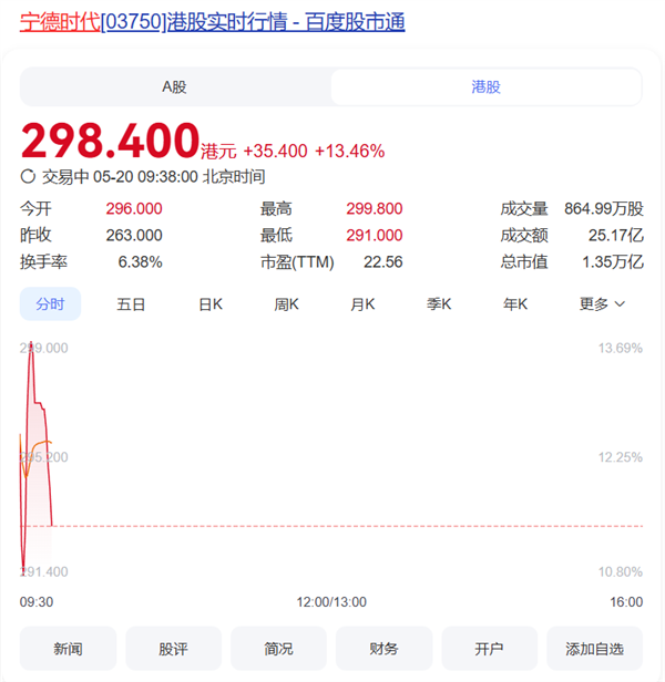 快科技5月20日消息,今日,宁德时代(股票代码:03750.HK)在香港联交所主板正式挂牌上市,上市首日高开12.55%,报296港元,发行价为263港元,最新总市值达1.34万亿港元。
