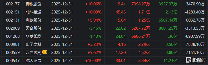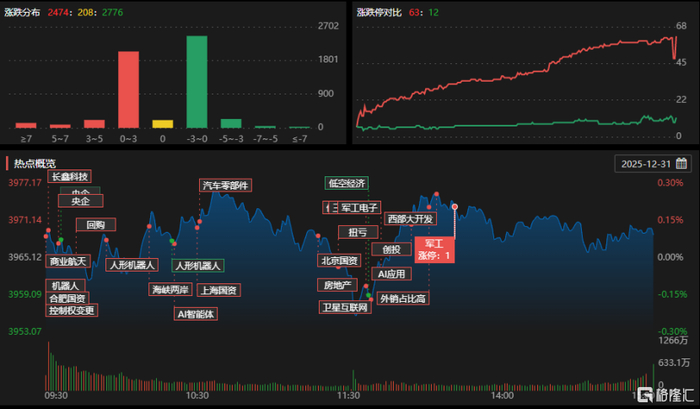 12月31日,沪指涨0.09%,深证成指跌0.58%,创业板指跌1.23%。全市场成交额2.07万亿元,较前一交易日缩量956亿元,逾2700股下跌。商业航天、AI应用、房地产、教育、航空机场等板块涨幅居前。