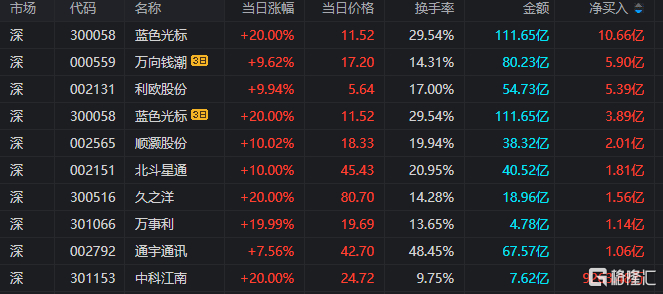 龙虎榜单日净买入额前三为蓝色光标、利欧股份、顺灏股份,分别为10.66亿元、5.39亿元、2.01亿元。