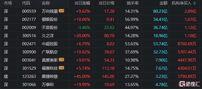 龙虎榜中涉及机构专用席位的个股中,当日净买入额前三为御银股份、天奇股份、久之洋,分别为1.67亿元、1.12亿元、1.10亿元。