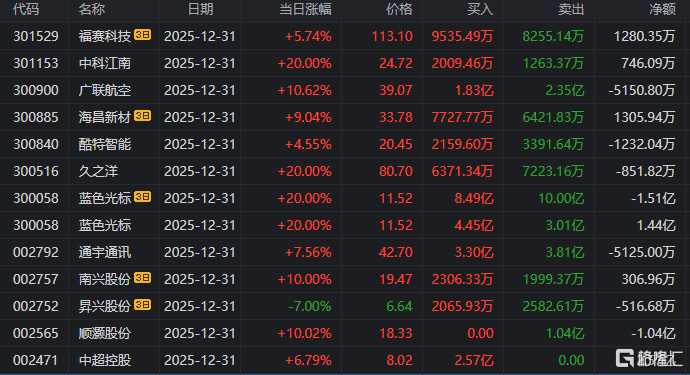 龙虎榜中涉及机构专用席位的个股中,当日净卖出额前三为航天发展、顺灏股份、合兴包装,分别为3.18亿元、8374.60万元、5931.41万元。