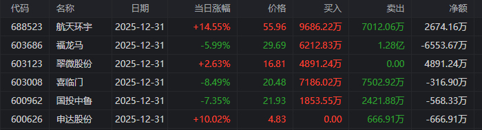 在龙虎榜中,涉及沪股通专用席位的个股有6只,福龙马的沪股通专用席位净卖出额最大,净卖出6553.67万元。