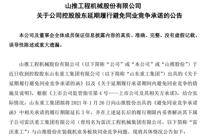 1月12日晚间,山推股份(SZ000680,股价12.51元,市值187.67亿元)公告称,公司控股股东山东重工集团有限公司(以下简称“山东重工”)拟将2021年1月26日向山推股份出具的《避免同业竞争承诺函》中相关承诺的履行期限延长3年,并在上述延长后的履行期限内妥善解决其下属子公司雷沃重工集团有限公司(以下简称“雷沃重工”)与山推股份在装载机业务板块同业竞争问题。