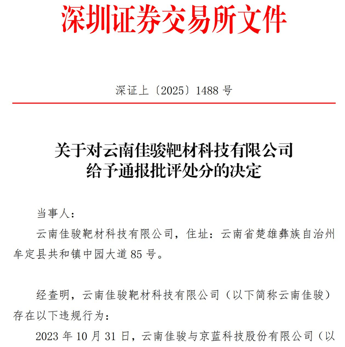 针对这一违规行为,12月30日,深交所发布《关于对云南佳骏靶材科技有限公司给予通报批评处分的决定》指出,云南佳骏未按照公开披露的信息履行业绩补偿承诺,违反了《股票上市规则》的相关规定,决定对其给予通报批评处分,并记入上市公司诚信档案。