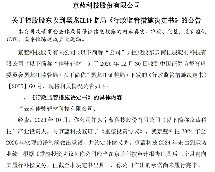 同日,ST京蓝公告收到黑龙江证监局下发的《行政监管措施决定书》,查明云南佳骏违反了《上市公司监管指引第4号——上市公司及其相关方承诺》等规定,决定对其采取责令改正的行政监督管理措施,并记入证券期货市场诚信档案。