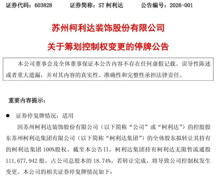 ST柯利达(603828)最新公告筹划控制权变更,公司股票自2026年1月5日起停牌。公司股价2025年累计涨幅达189%。