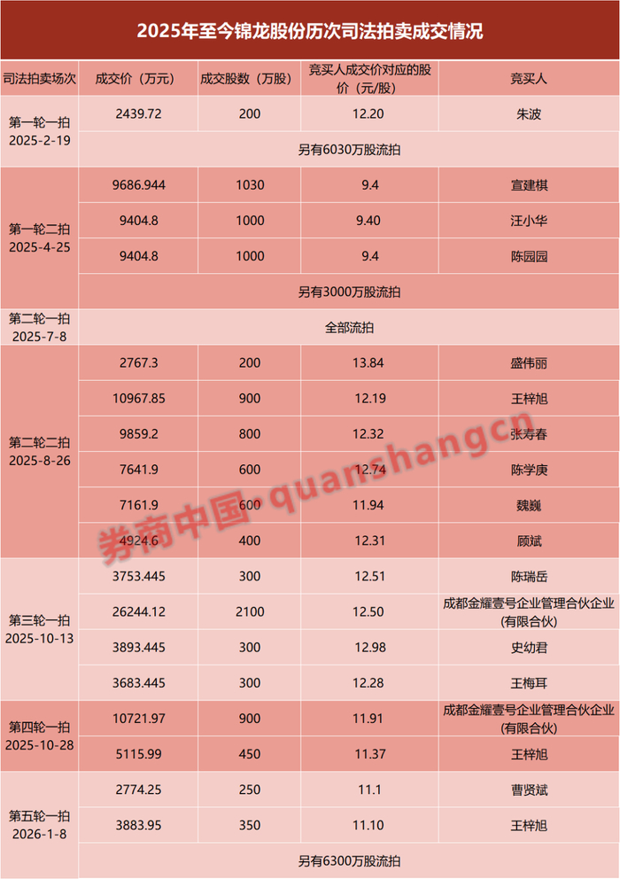 券商中国记者统计整理2025年至今锦龙股份历次司法拍卖情况,由于司法拍卖的股份在过户后的6个月内不可以交易,因此记者以2025年8月至12月参与竞买的10名投资者作为观察样本,其成本价平均在12.22元/股。