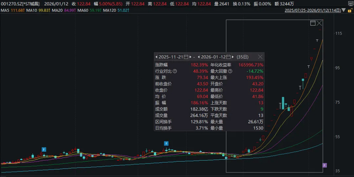 Wind行情数据显示,自2025年12月31日以来,*ST铖昌股票已经连续7个交易日涨停。而若把时间线拉长,自2025年11月下旬以来,公司股价累计涨幅超过180%。