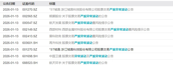 1月12日晚间,还有数十家A股公司发布股价异常波动公告,其中,顺灏股份、航天发展、西部材料、雷科防务、再升科技、中国卫通、航天环宇等发布了股票交易严重异常波动相关公告。