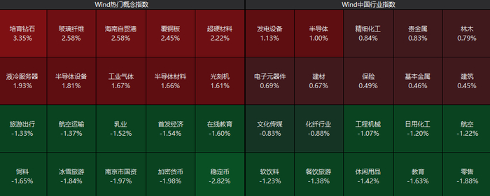 从板块上看,海南自贸港概念股延续强势,化工板块异动拉升,贵金属、超硬材料、半导体板块表现活跃;而零售、餐饮旅游、文化传媒等板块跌幅居前。