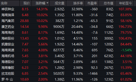 海南自贸港概念股延续强势,海南瑞泽、海汽集团涨停,康芝药业、海南海药、海峡股份等跟涨。